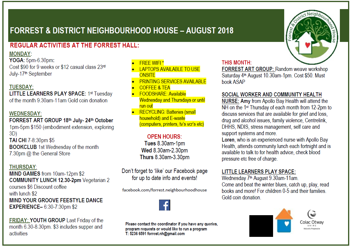 Please note we now have Amy, a social worker from Apollo Bay Health coming on the first Thursday of the month from 12pm-2pm (see flyer attached).  We also have community nurse Loren, visit fortnightly and is available for advice and to check blood pressure etc free of charge.